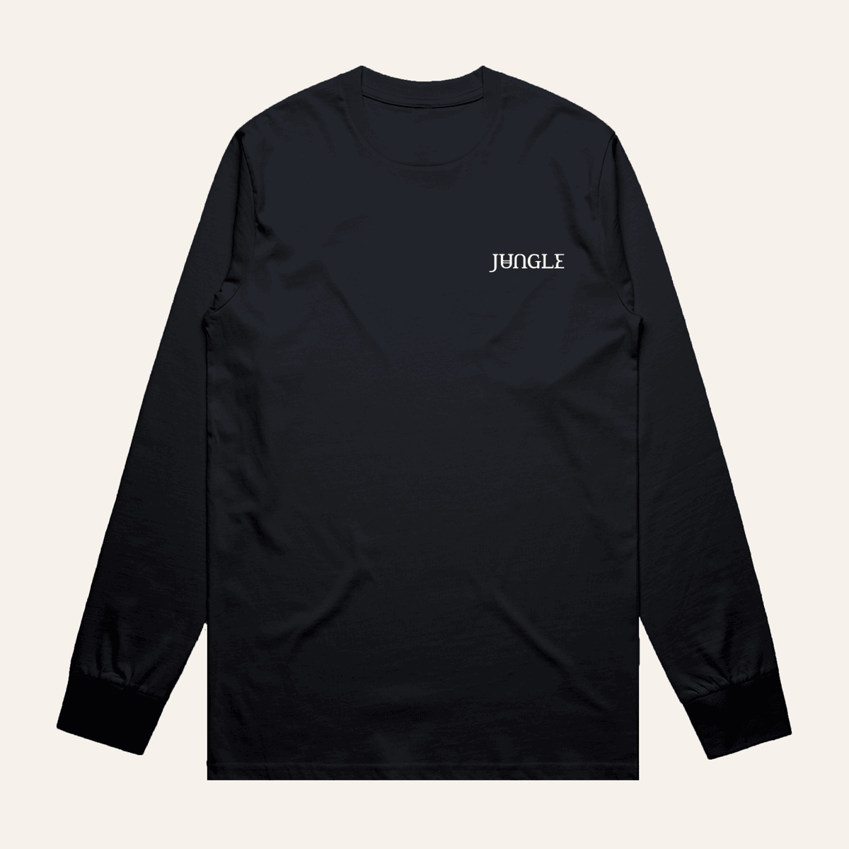 コットン100%、ブラックの長袖Tシャツ。