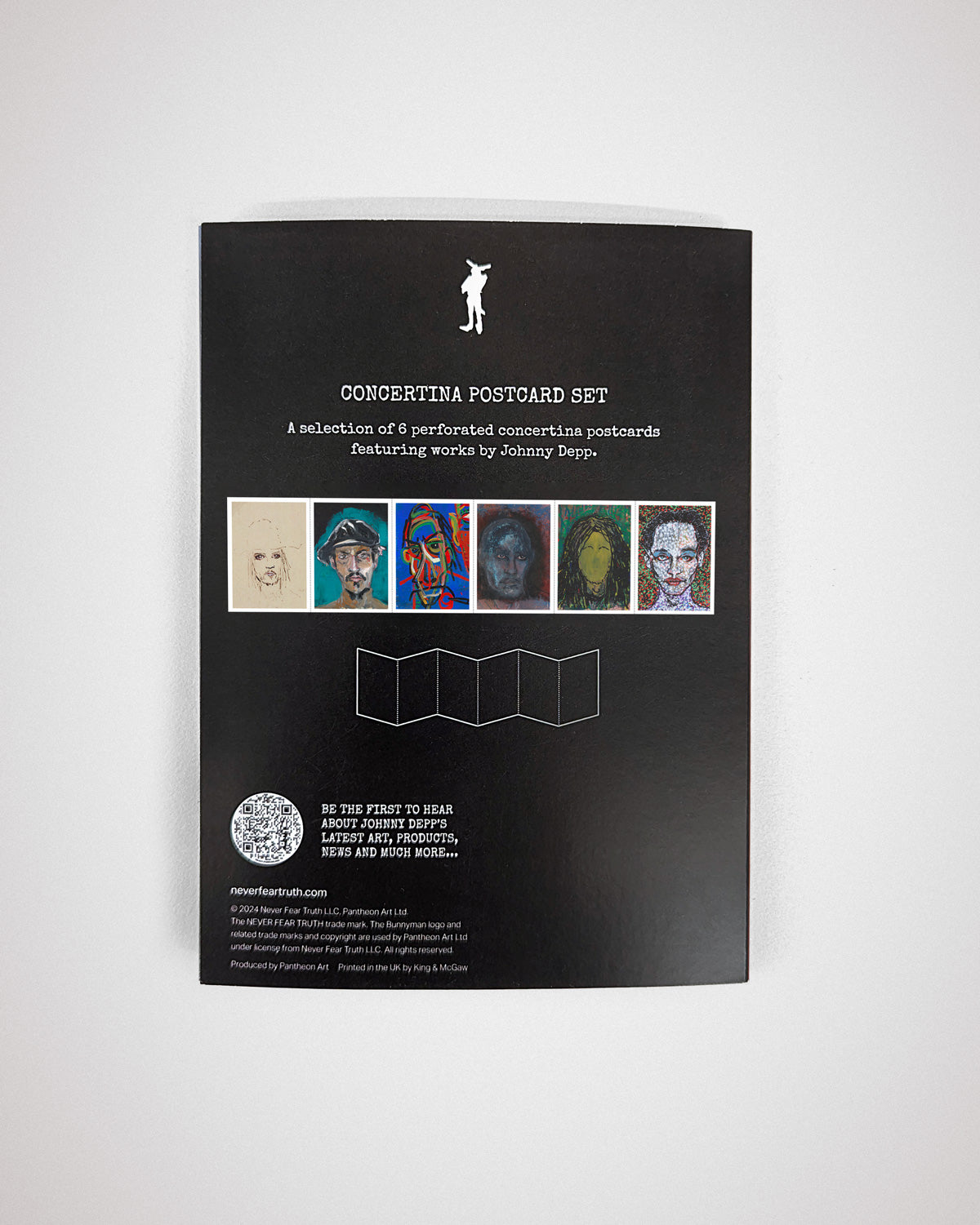 この6枚の蛇腹式ポストカードの中には、ジョニー・デップによるポートレートが収められています。自画像でしょうか?いくつかは特に謎めいています。厳選されたこれらの作品は、彼の愛する鮮やかな色彩から、衝動的な絵の具の飛び散り、荒々しい線まで、このアーティストの多様な創作手法と技法を余すところなく示しています。何よりも、ジョニーがさまざまな肖像画スタイルを通じてその形と、個性を描き出す能力をいかに磨いてきたかがわかります。